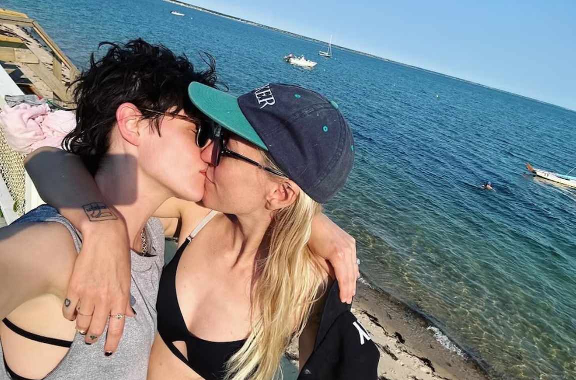 En la imagen se puede ver a Stewart y Meyer darse un beso a la orilla de la playa. «Encuéntrame bajo las sábanas, escondiéndome de la policía de la felicidad», indicó la guionista en la publicación.